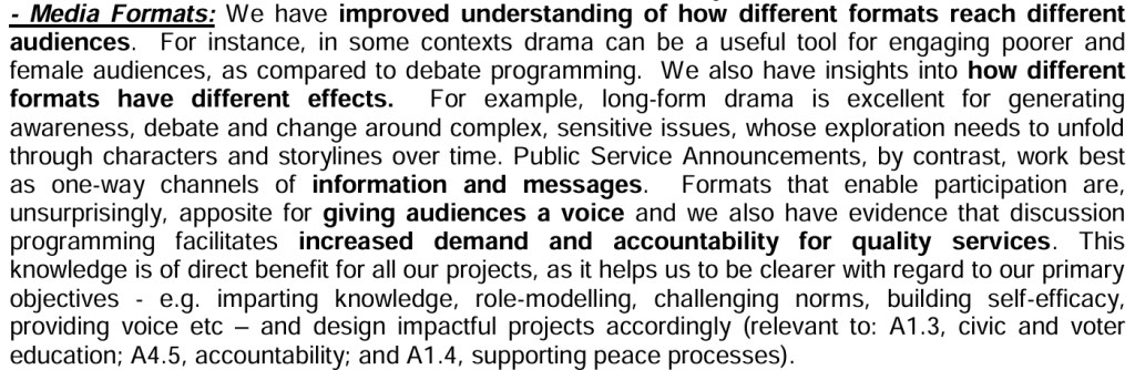 “We recognise that different formats achieve different things when it comes to change… and consider audience needs, objectives and operational context when deciding which format to use,” BBCMA asserts in one file. In another, the organization crows, “people exposed to our programming are more likely to: have higher levels of knowledge on governance issues; to discuss politics more; to have higher internal efficacy (the feeling that they are able to do something); and participate frequently in politics.”
