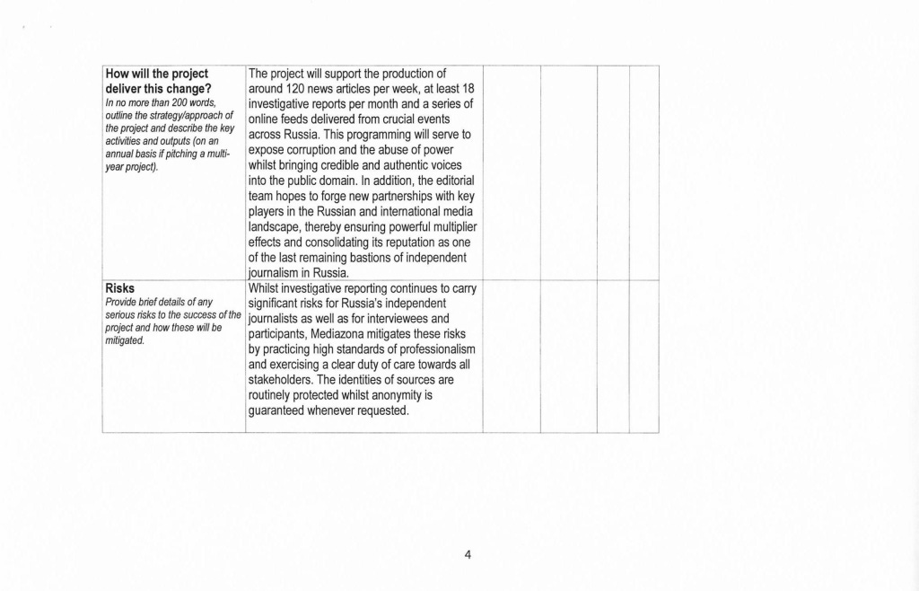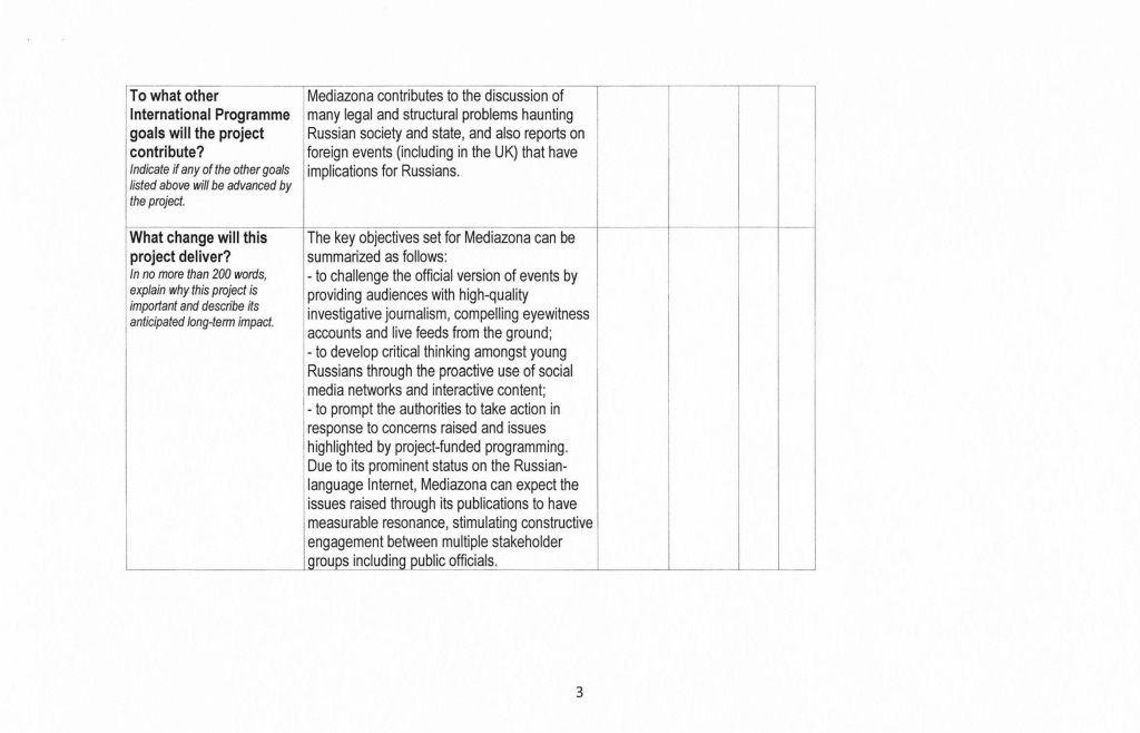 Boasting that “Mediazona contributes to the discussion of many legal and structural problems haunting Russian society and state, and also reports on foreign events (including in the UK) that have implications for Russians,” the proposal laid out the “key objectives set for Mediazona,” which included “[challenging] the official version of events by providing audiences with high-quality investigative journalism, compelling eye witness accounts and live feeds from the ground.” If approved, Mediazona would also “develop critical thinking amongst young Russians through the proactive use of social media networks and interactive content.”