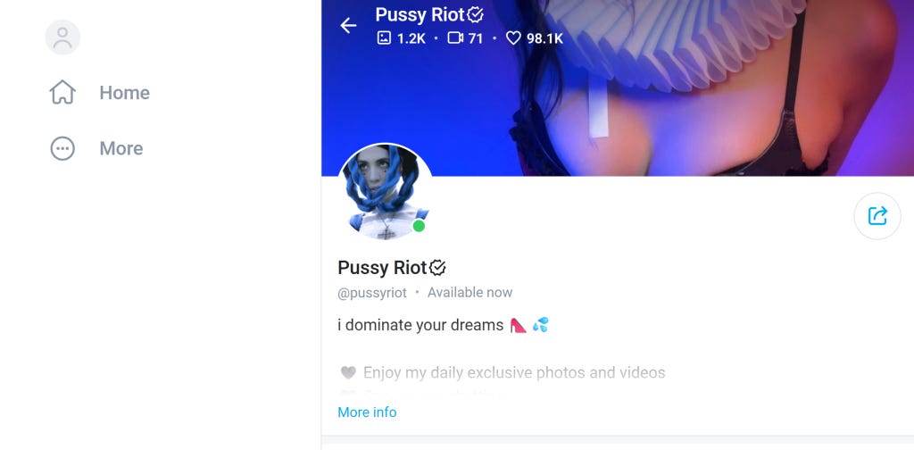 As funding from Western governments dries up, Pussy Riot has launched a page on OnlyFans. The group’s “fetish/kink friendly” official profile on the website, widely used by sex workers, promises paying subscribers “daily exclusive photos and videos,” “one on one chatting,” “custom content and items,” and “exceptional service for all your personal requests.”
