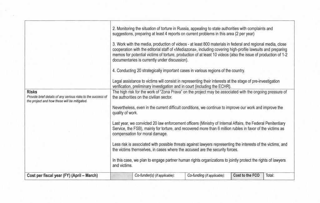 The applicants bragged that Mediazona’s “prominent status on the Russian-language internet” meant “issues raised through its publications” would “have measurable resonance, stimulating constructive engagement between multiple stakeholder groups including public officials.”