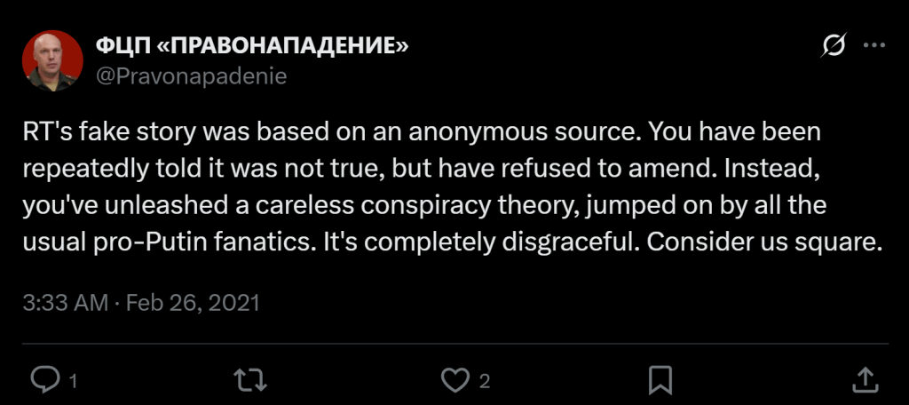 Meduza’s then-investigative editor, Alexey Kovalev, appeared to acknowledge the bogus story was revenge for articles exposing Britain’s clandestine support of both Mediazona and Kovalev’s employer, Meduza. In a 2021 tweet, Kovalev accused the author of this article of having “unleashed a careless conspiracy theory,” insisting that the leaked documents exposing those ties were “fake.” In closing, he sneered: “consider us square.”