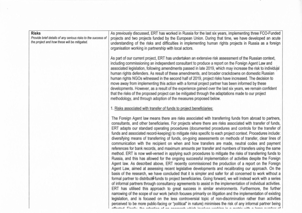 The leaked documents make clear that the British were aware that their activities were illegal under Moscow’s Foreign Agent law. A funding application for Equal Rights Trust, a Global Britain Fund recipient charged with lawfare operations referred to cryptically as “targeted strategic litigation” explicitly describes a British government-funded effort to evade the new law. “As part of our current project” being financed by the UK Foreign Office, ERT wrote that it “has undertaken an extensive risk assessment of the Russian context, including commissioning an independent consultant to produce a report on the Foreign Agent Law.” As a result, “ERT is now well-versed” in various “procedures to mitigate the risks of transferring funds to Russia,” which “allowed for the ongoing successful implementation of activities despite the Foreign Agent law.”