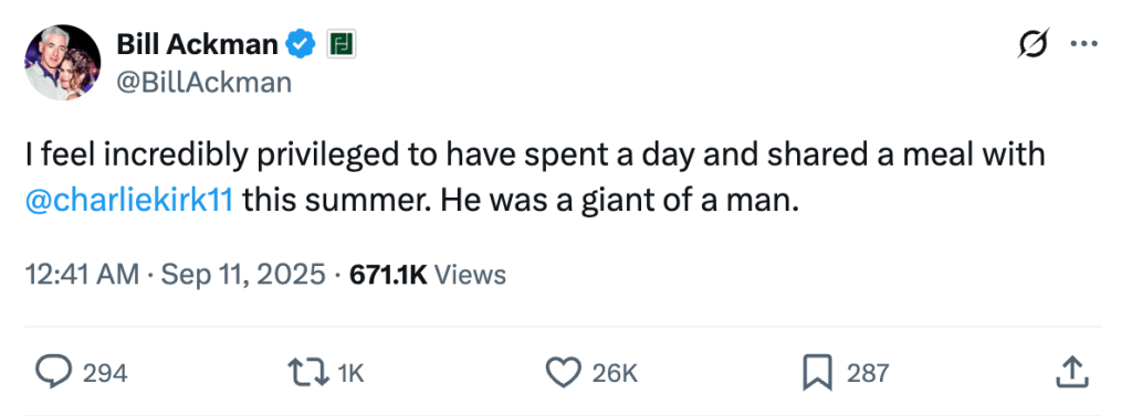 On September 11, one day after the assassination of Charlie Kirk, billionaire pro-Israel moneyman Bill Ackman took to Twitter/X to trumpet his relationship with the late conservative operative. “I feel incredibly privileged to have spent a day and shared a meal with @charliekirk11 this summer. He was a giant of a man.”