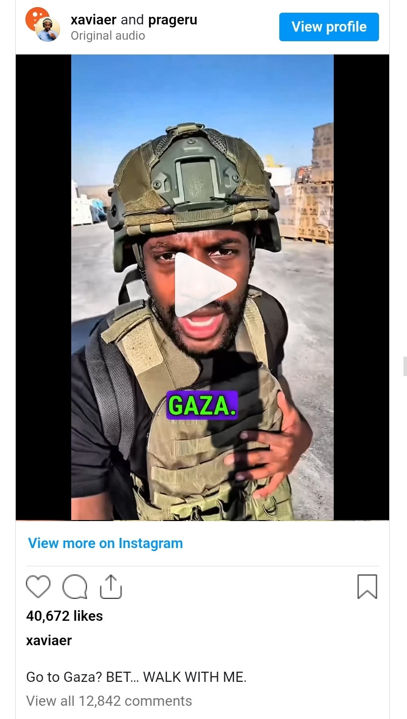 Xaviaer DuRousseau – DuRousseau is employed by Prager U, the premier right-wing “edu-tainment” hub targeting the minds of American youth. His boss, Marissa Streit, is a veteran of the Israeli army’s Unit 8200 cyber-spying division. A Black self-described former progressive, DuRousseau now appears firmly in the pocket of right-wing Zionist forces. During his Israeli government-funded visit to a Gaza Humanitarian Foundation “aid” hub inside Gaza, DuRousseau falsely claimed the United Nations and Hamas were to blame for the hunger sweeping the local population. “If I were Israel, I wouldn’t even provide matching socks to Gaza, but here’s all the aid that y’all claim doesn’t exist,” he said in an Instagram video filmed in front of boxes of aid blocked from entering Gaza. “Instead of Hamas distributing the ramen noodles,” DuRousseau continued, “their leaders are eating it all and that’s why they’re on Ozempic.”
